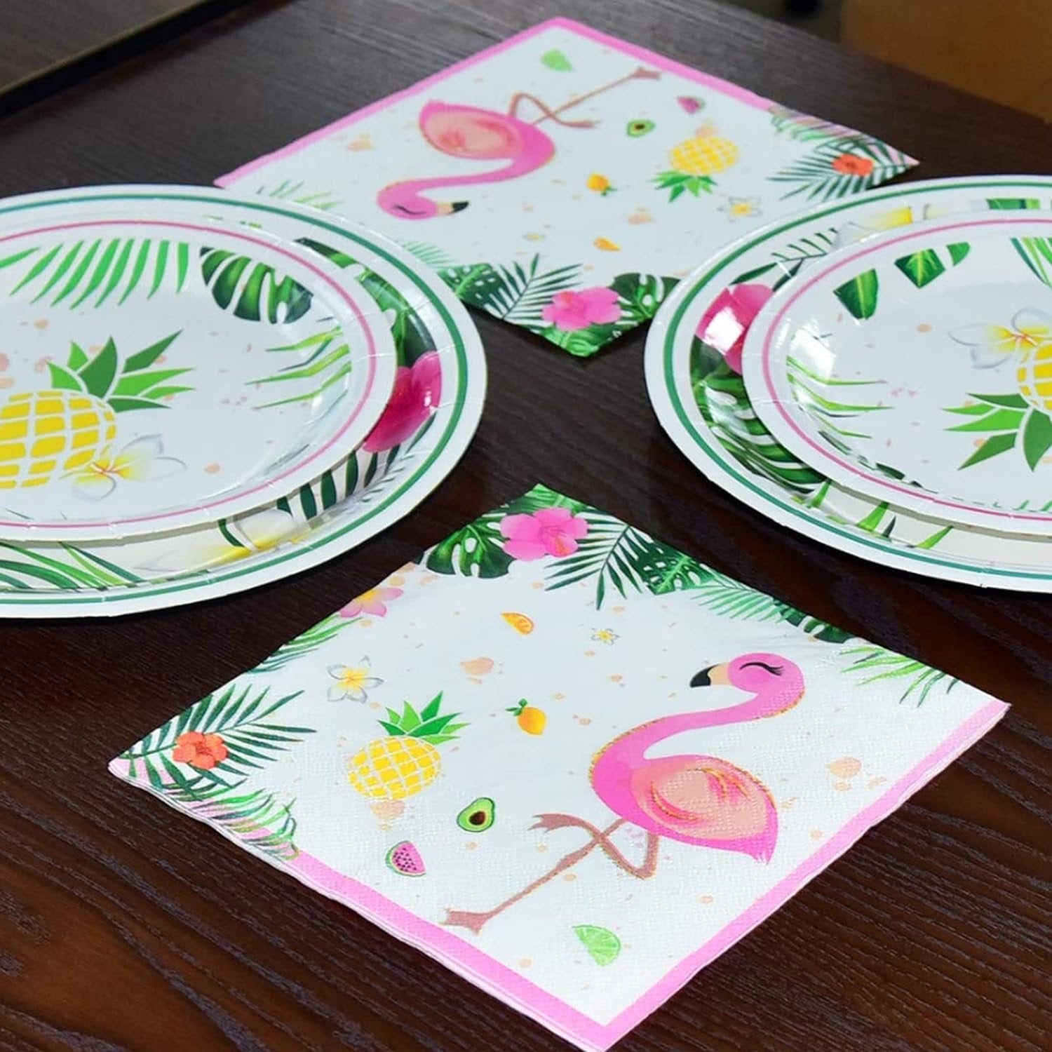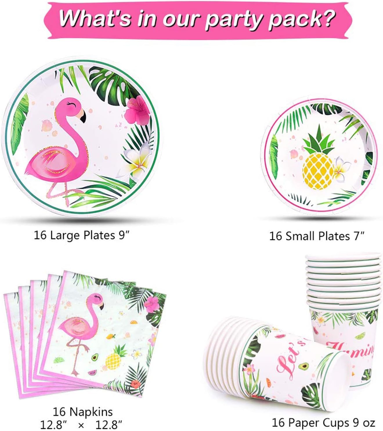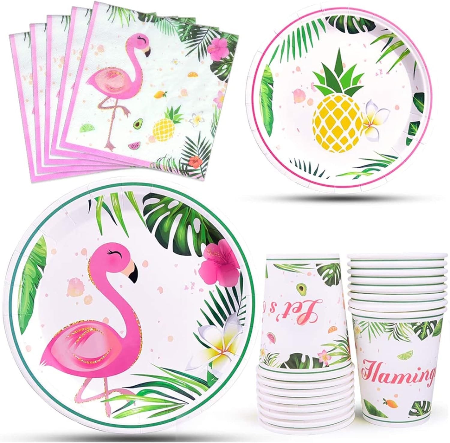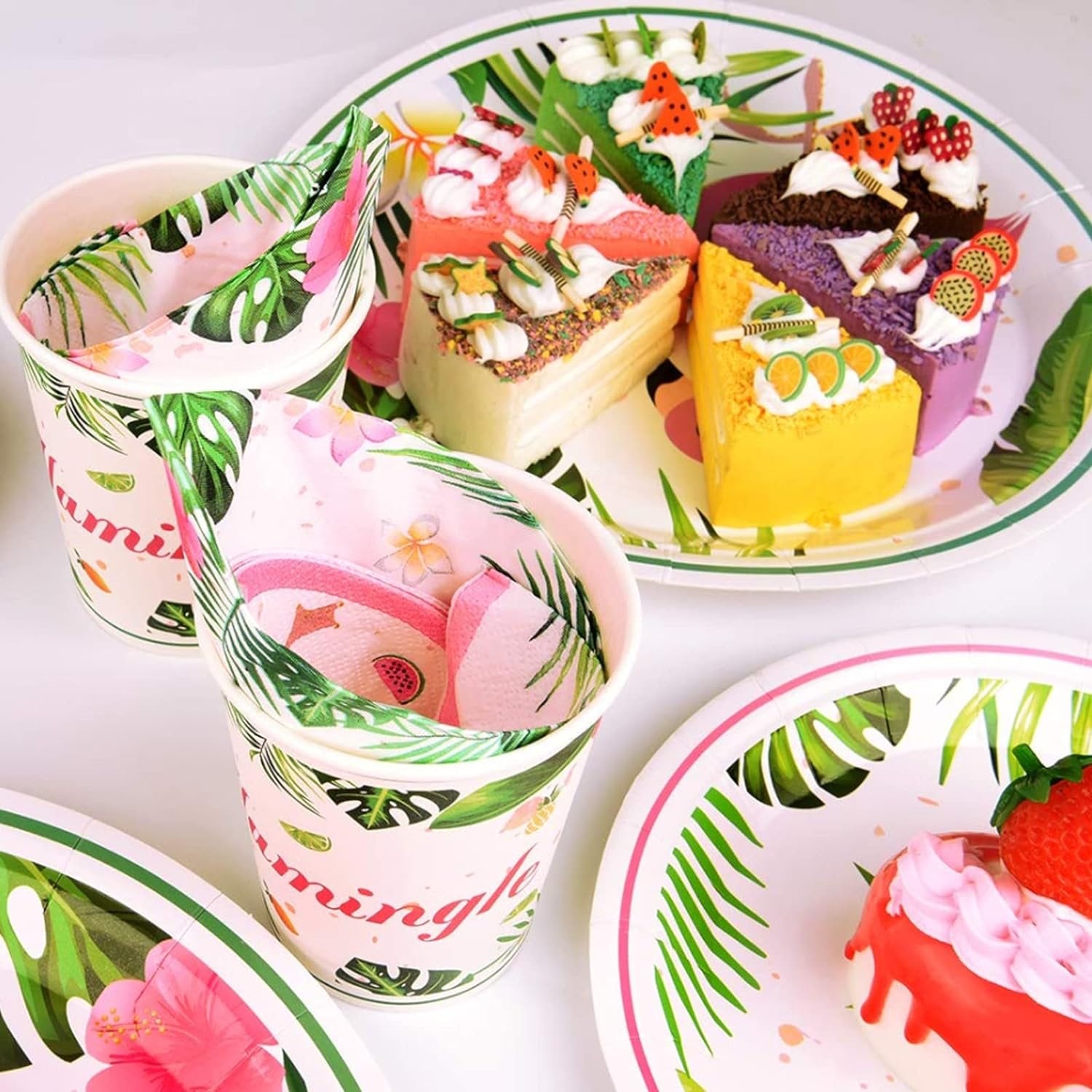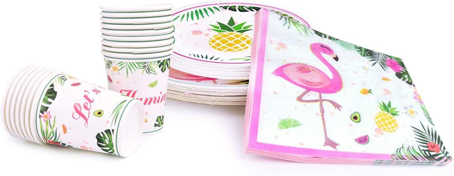 [MINSHI]パーティーアクセサリー-トロピカルパーティーデコレーション食器セットディナーデザートプレートナプキンとカップ女の子用子供誕生日ベビーシャワー16ゲスト64個