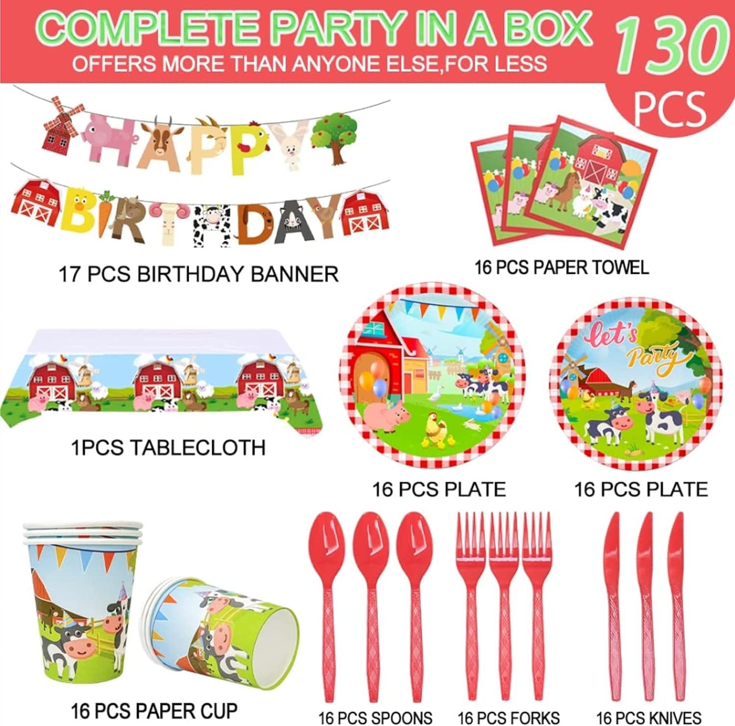 [MINSHI]ファームハウスファンバーンヤードアニマルズパーティー用品、130個ファームパーティー食器セット-ファームアニマルズバースデーバナー、ファームプレートカップナプキンテーブルクロスectファームバースデーパーティー用品、16人分 使い捨て食器
