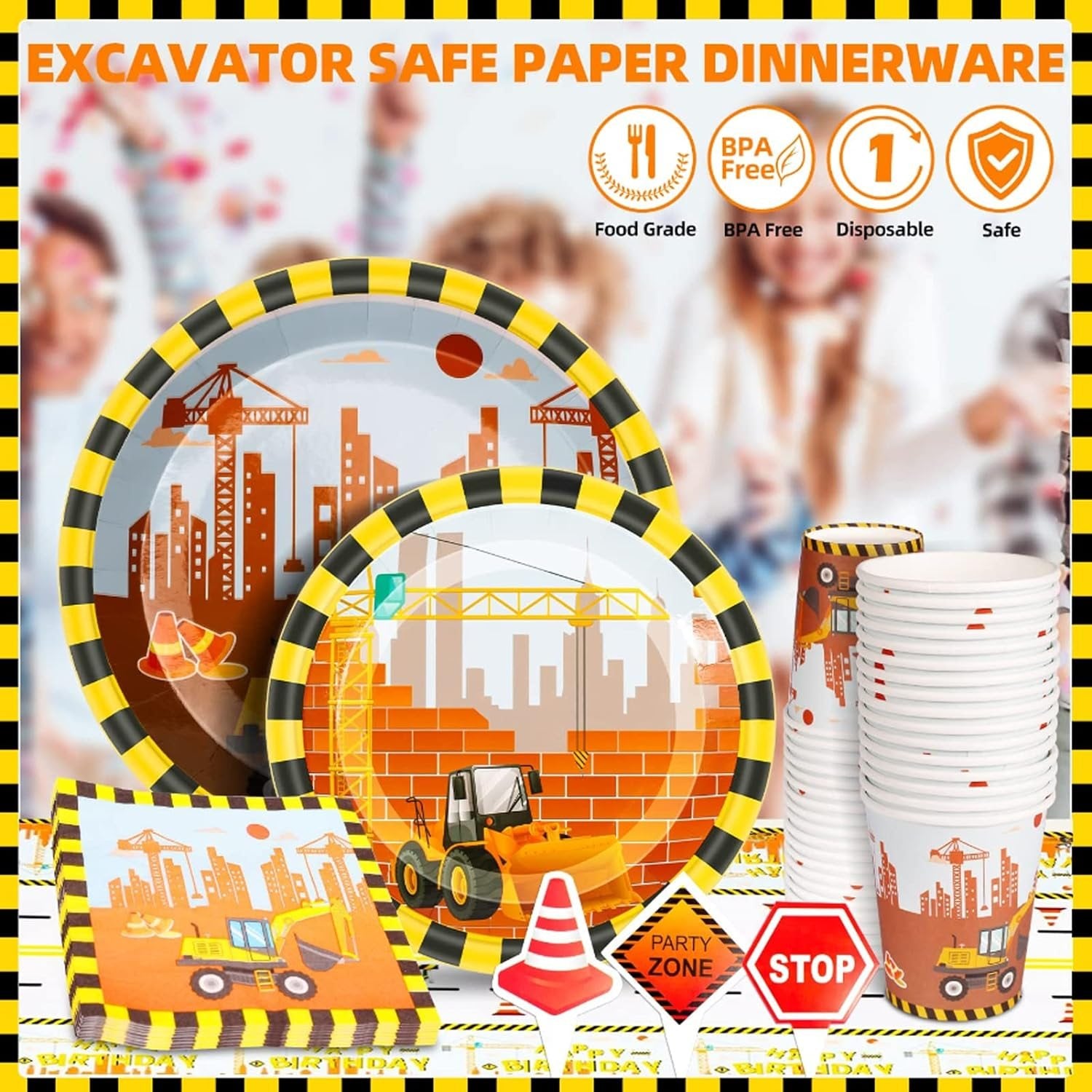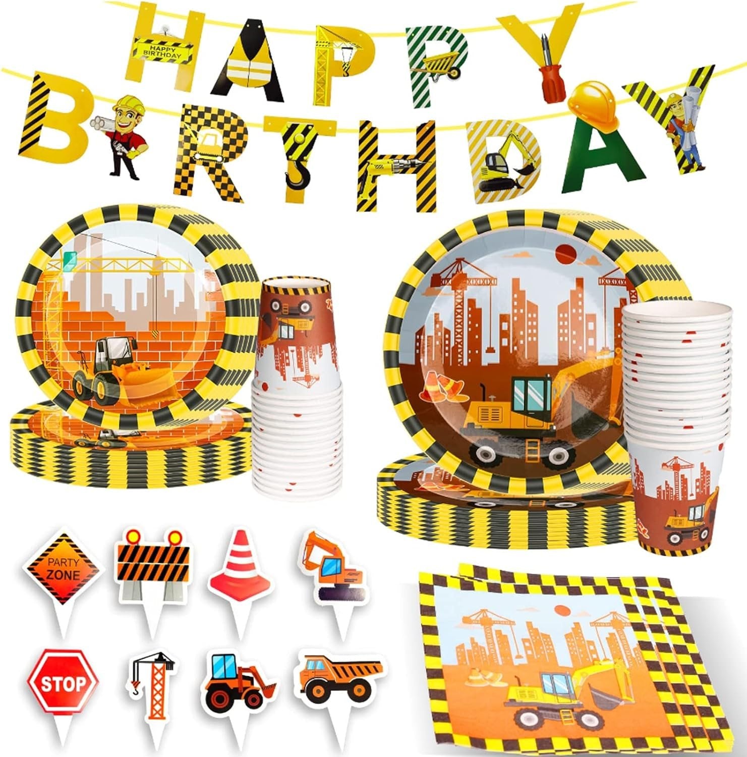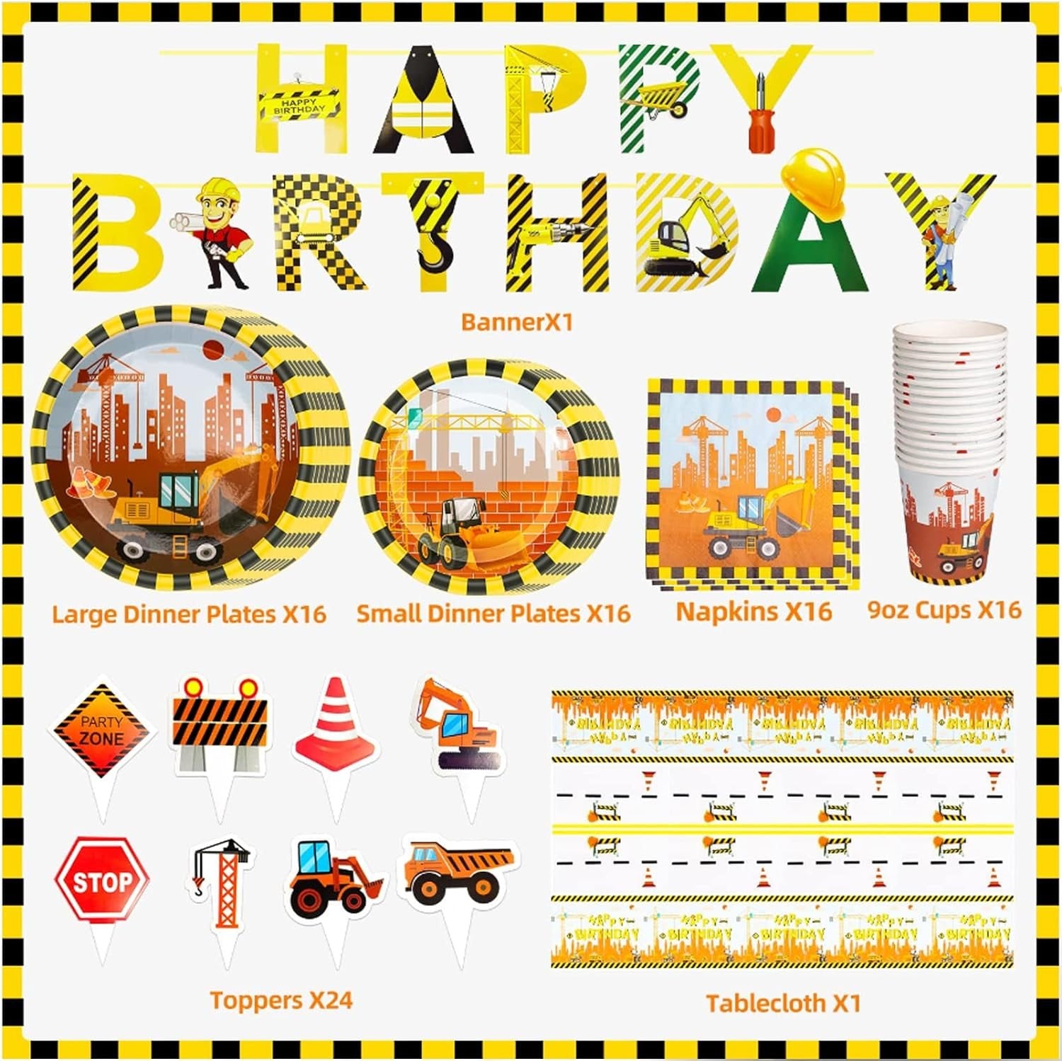 [MINSHI]建設現場の誕生日の装飾、90ディガーの誕生日の装飾のセット建設現場の装飾紙のプレート、紙コップ、ナプキン、トッパー、テーブルクロス、16人のゲストのためのバナーがセットされた子供の誕生日パーティー