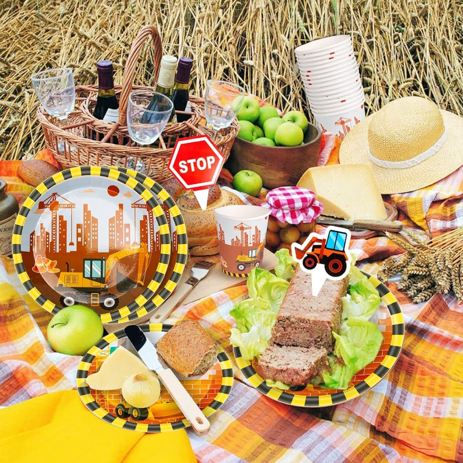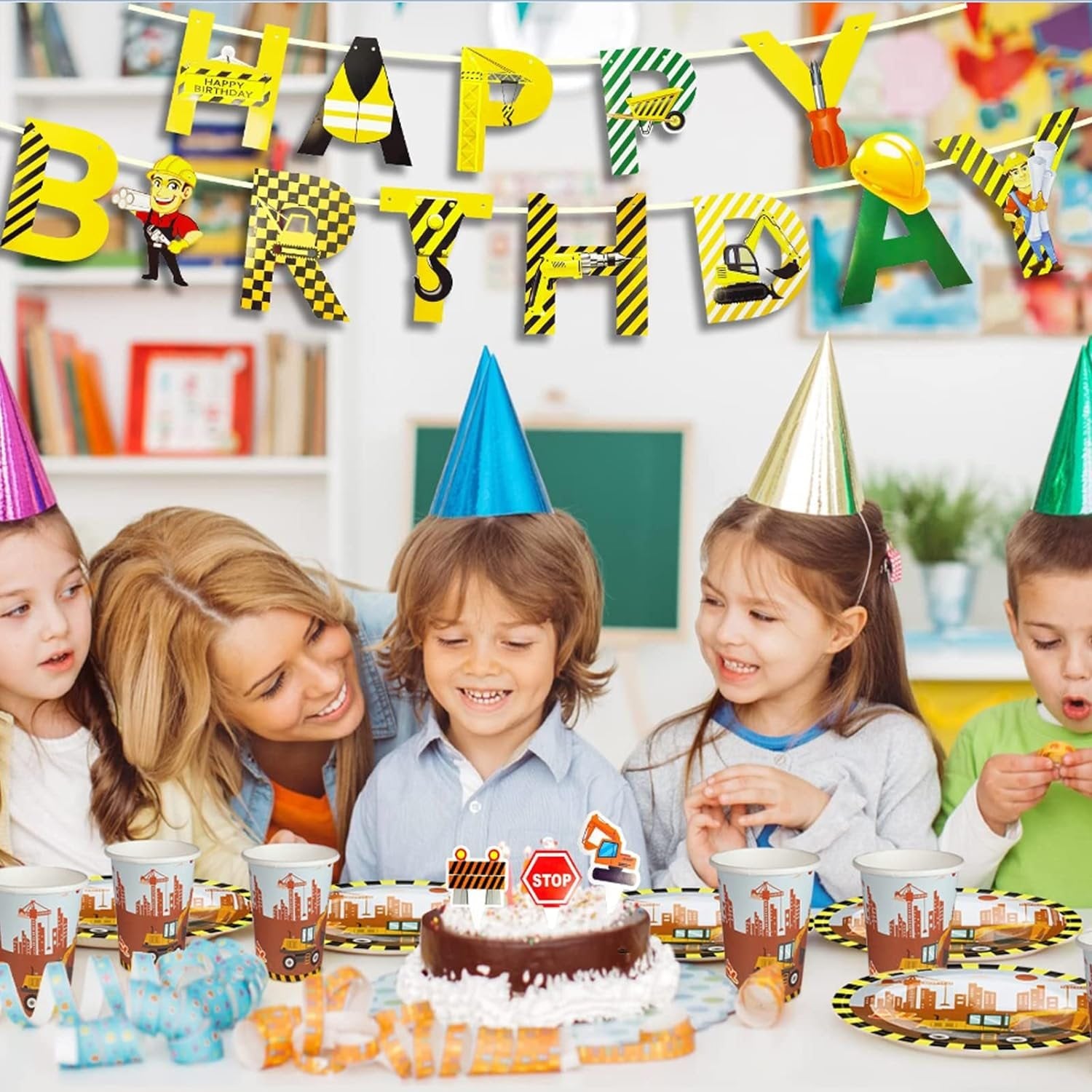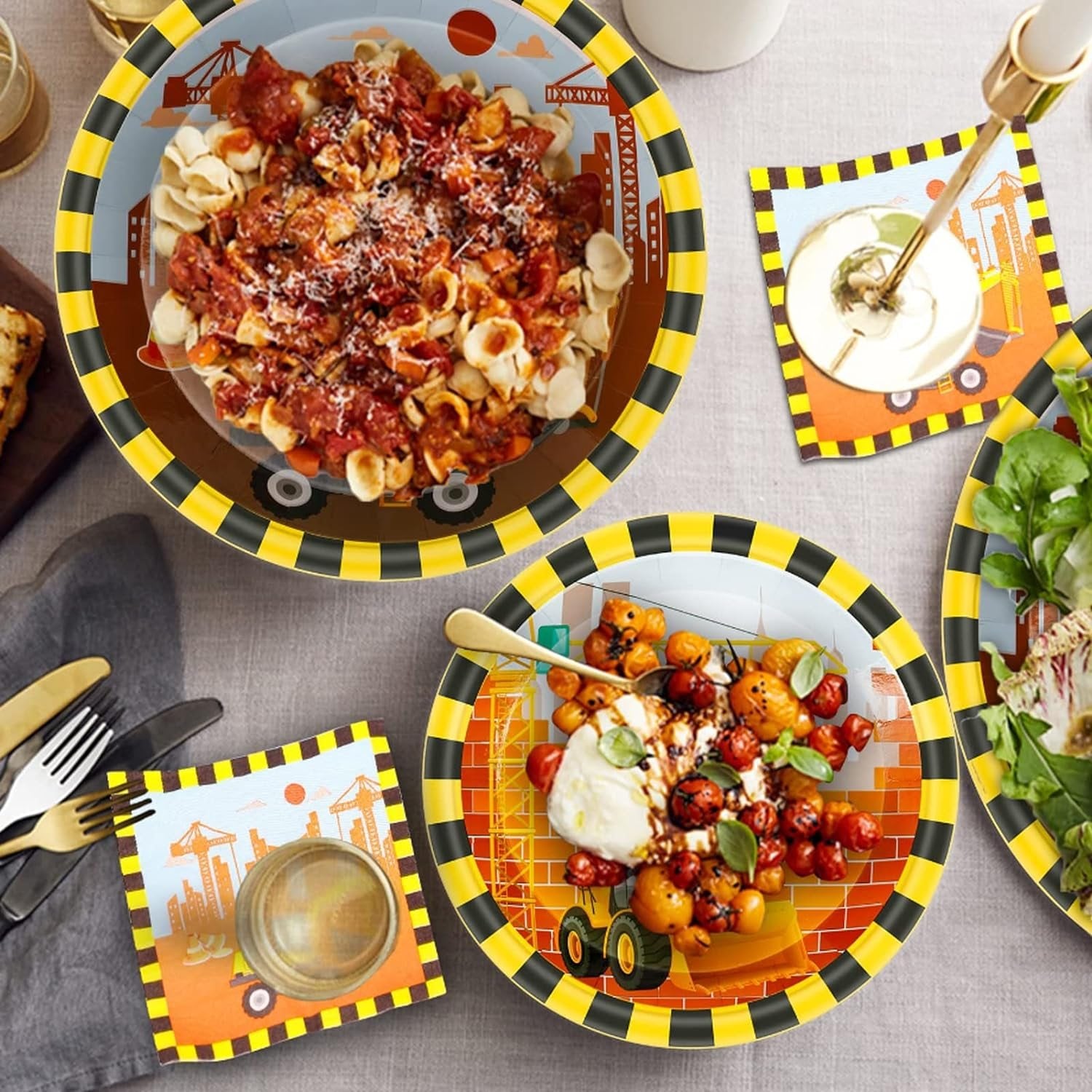 [MINSHI]建設現場の誕生日の装飾、90ディガーの誕生日の装飾のセット建設現場の装飾紙のプレート、紙コップ、ナプキン、トッパー、テーブルクロス、16人のゲストのためのバナーがセットされた子供の誕生日パーティー